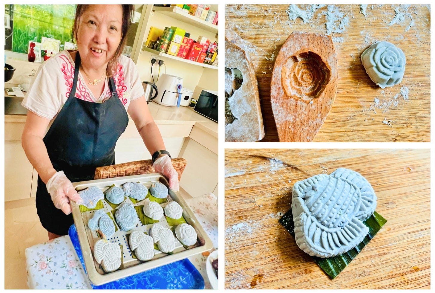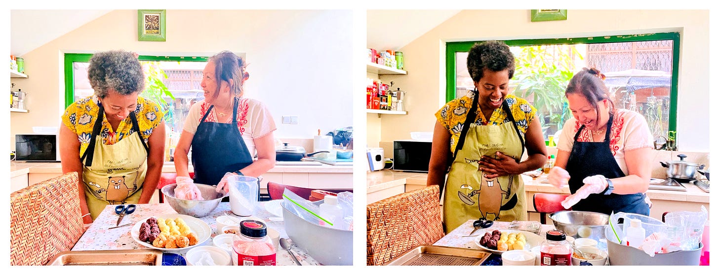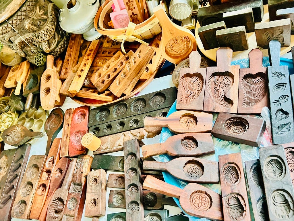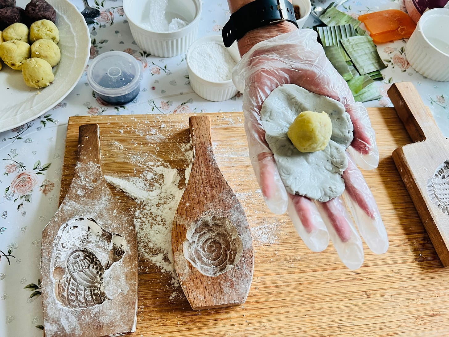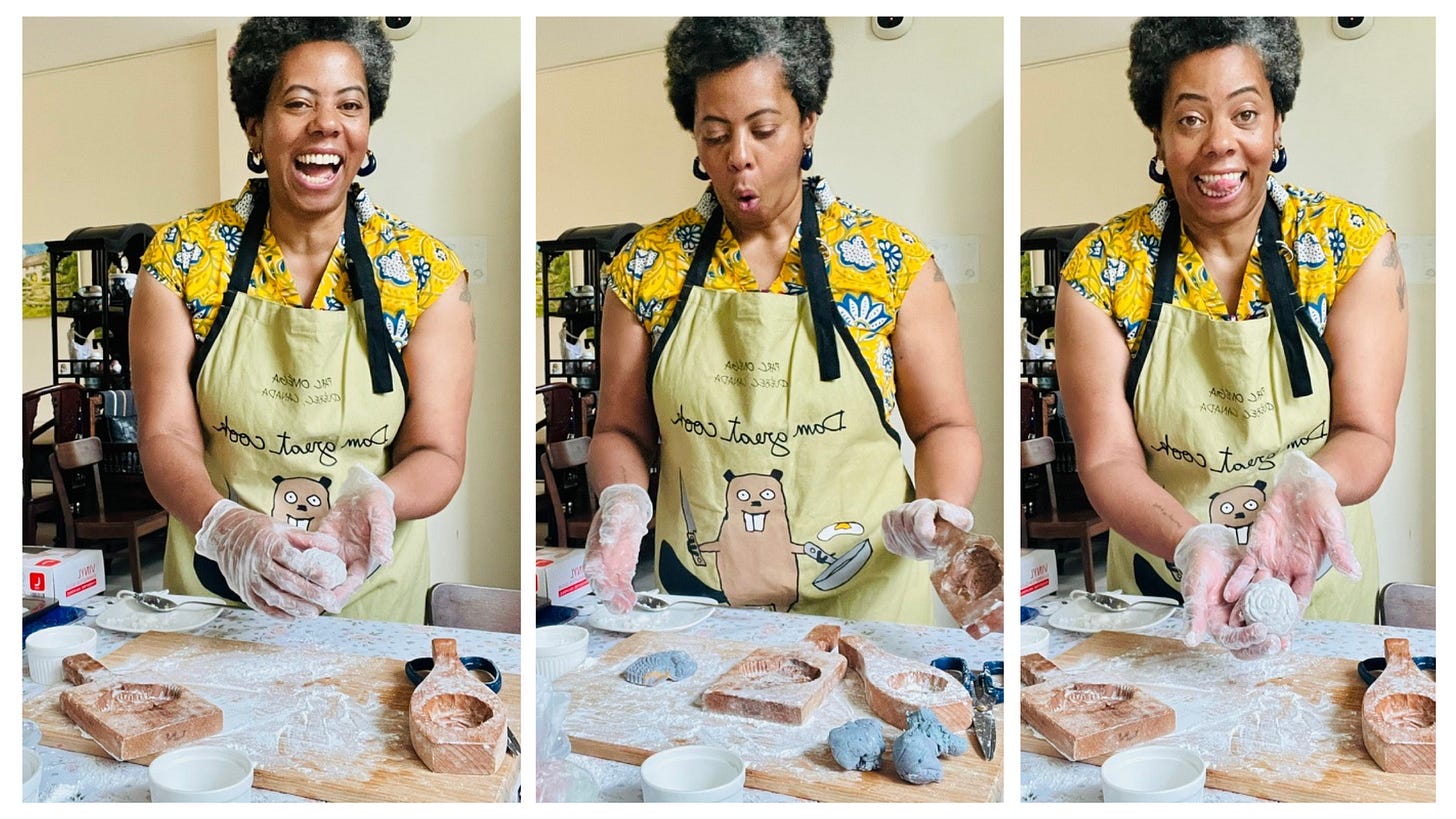 Then we started cooking. Or more accurately, I tried to follow along as Jasmine moved through a process that clearly lives in her memory, ancestry, and body, not on the page. We used beautifully carved wooden molds in the shapes of roses, ducks, fish, and pears.