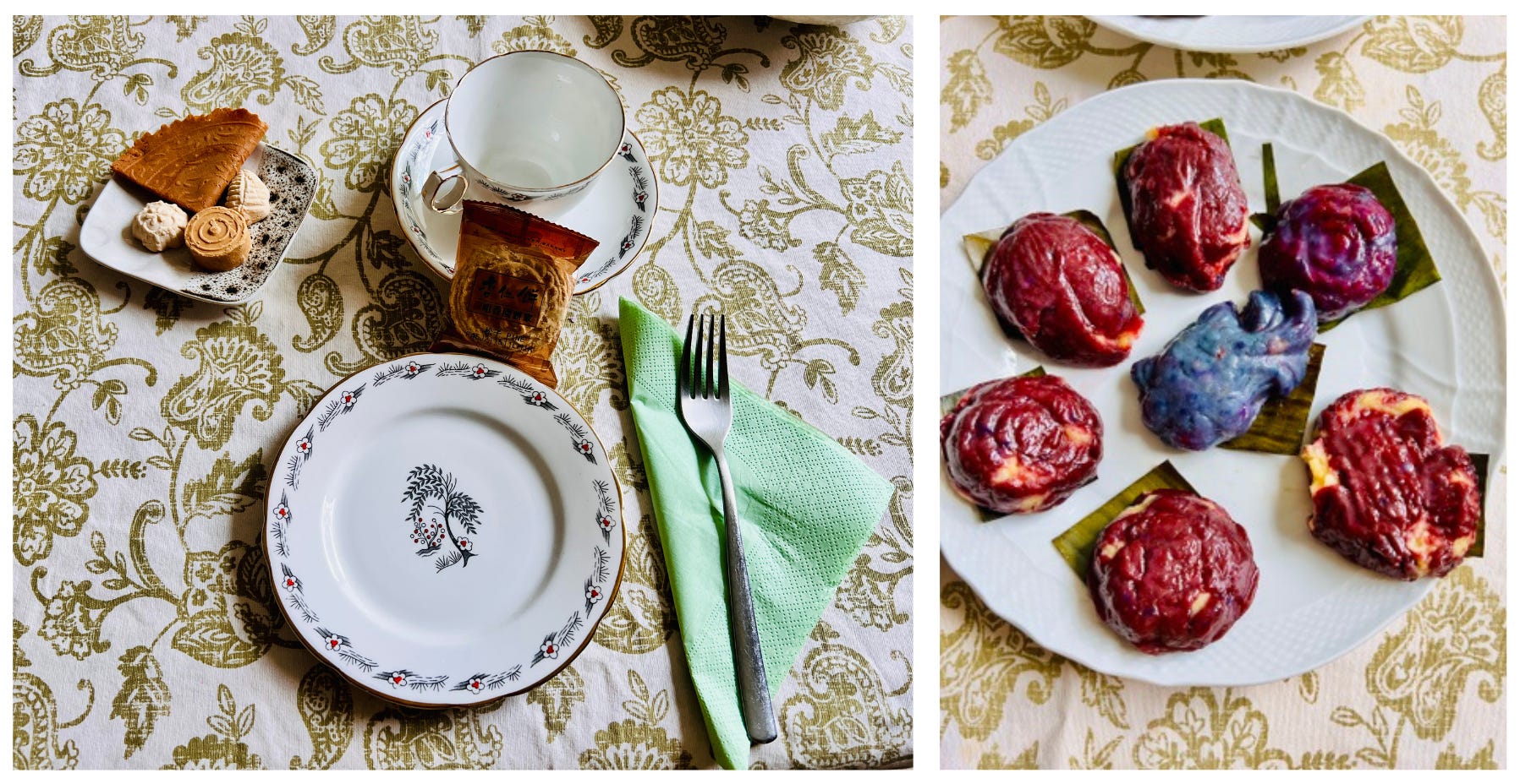 The table was set beautifully with a batik tablecloth and china. The steamed kueh looked vibrant and sculptural, each resting on its own banana leaf square on a silver platter.